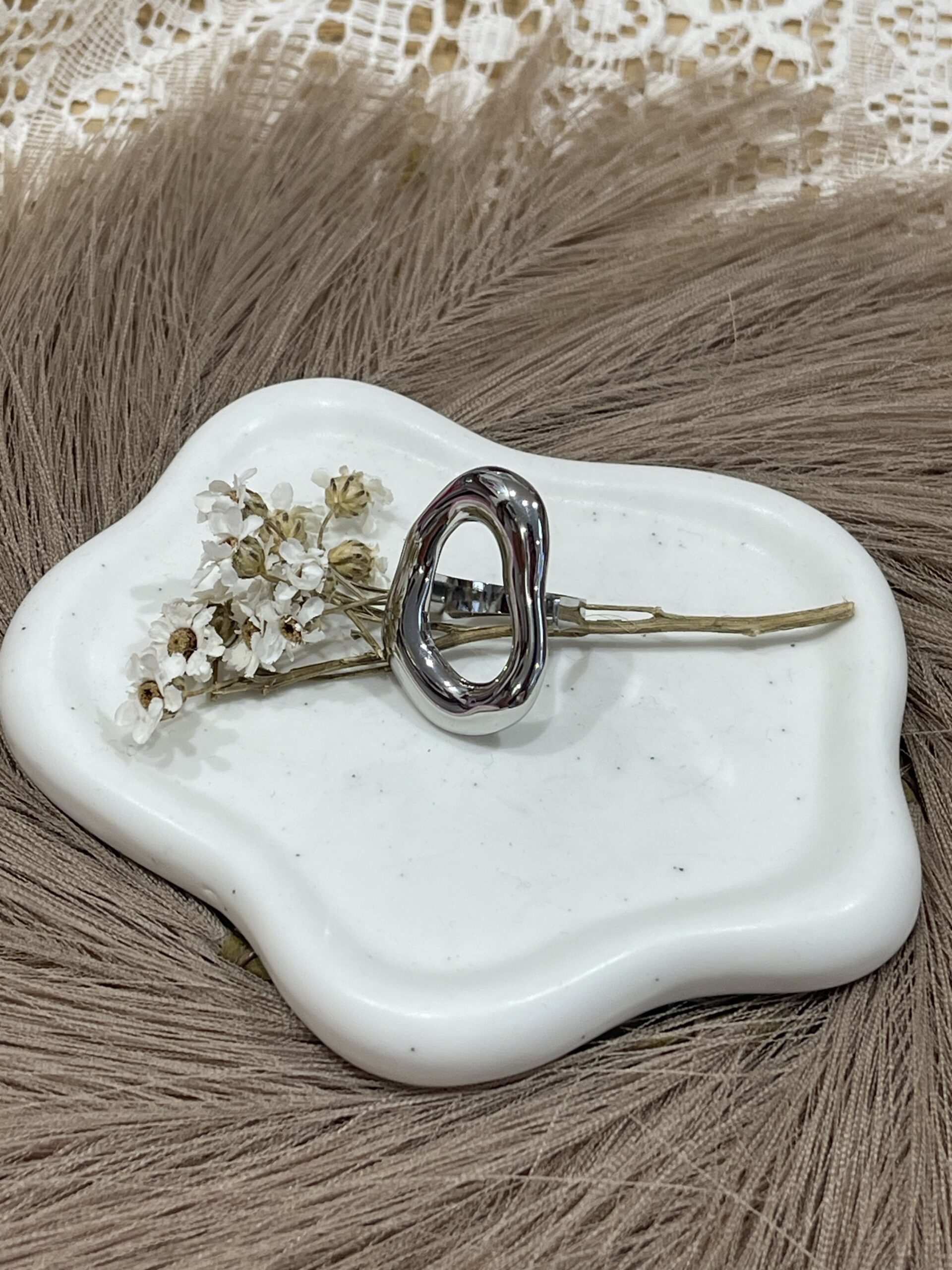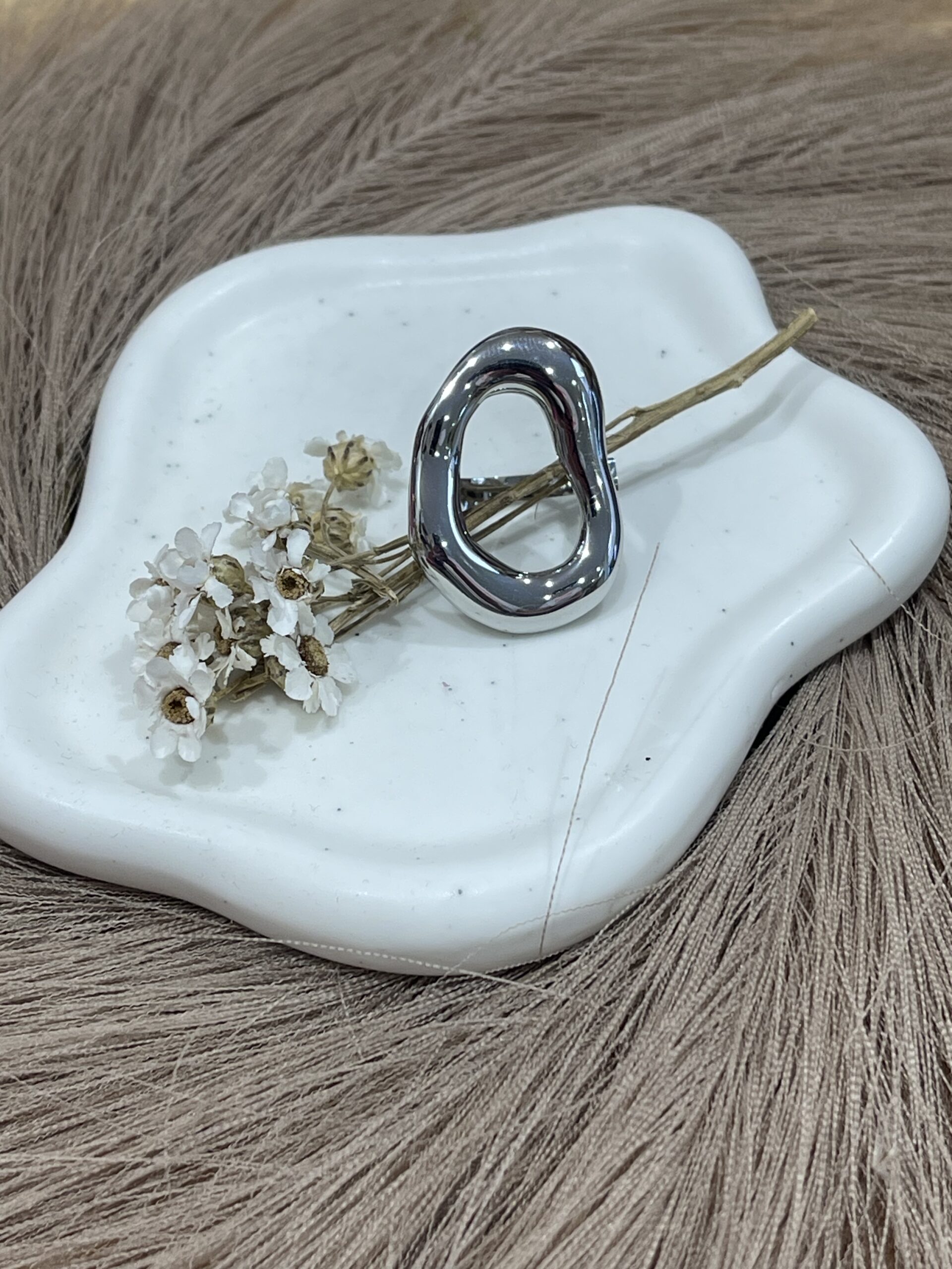 – Bague breloque ajustable en acier inoxydable argenté.