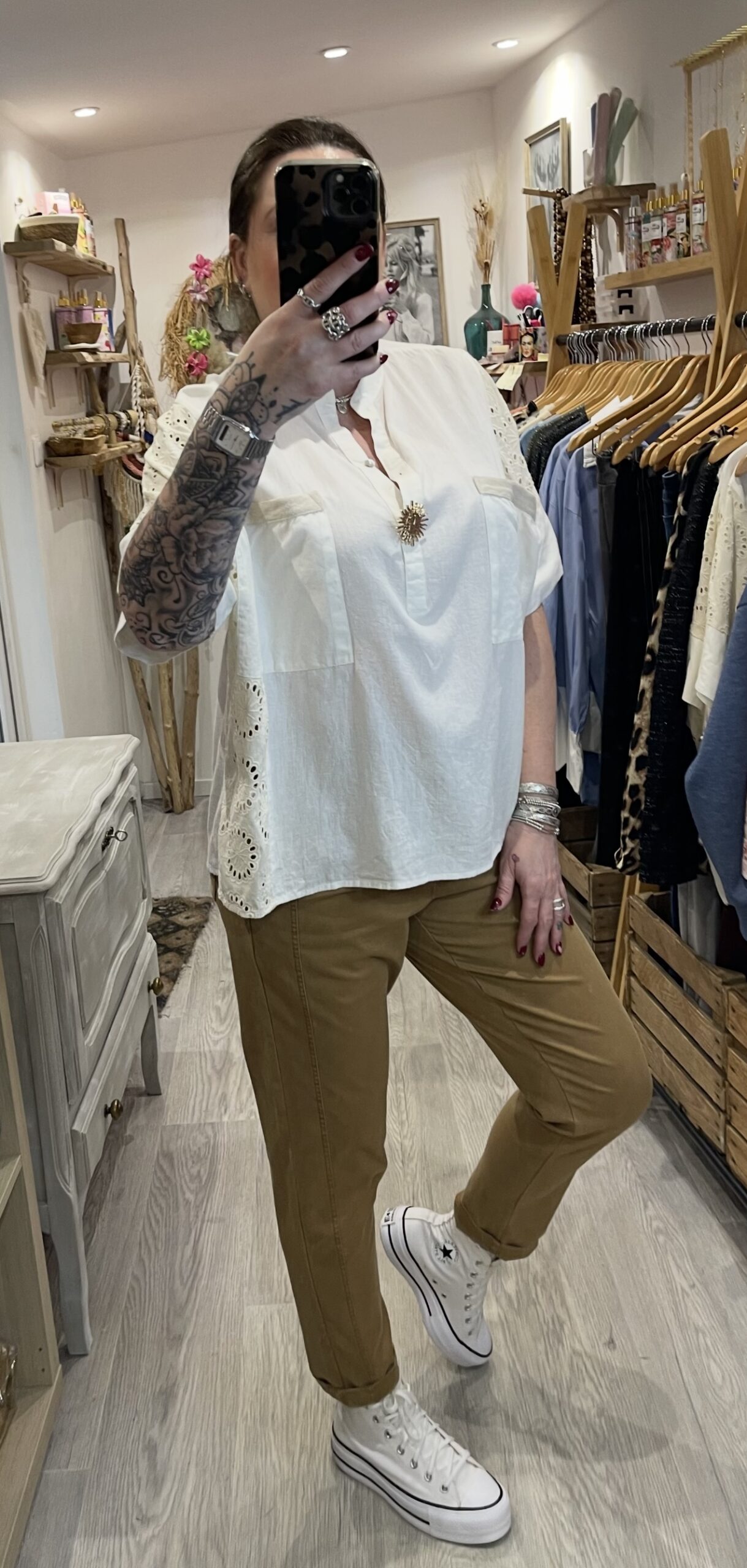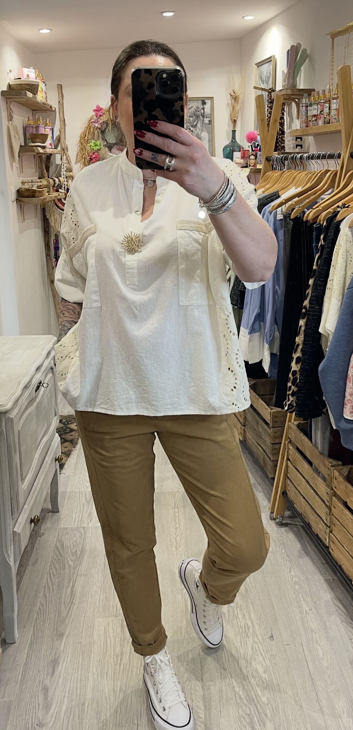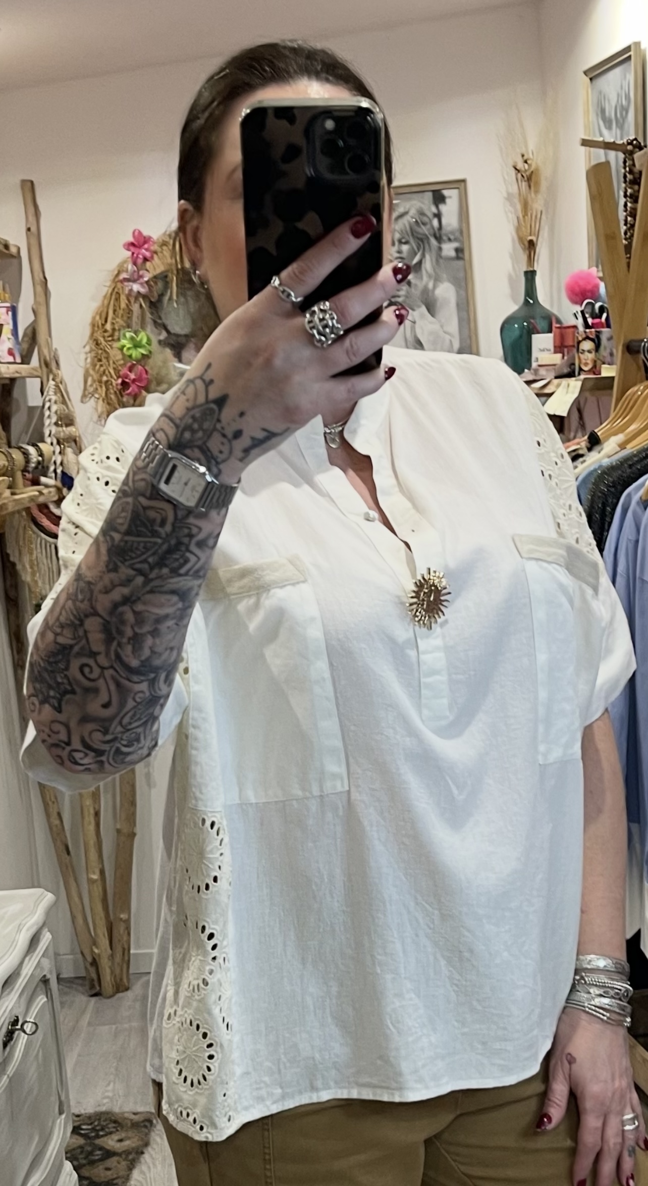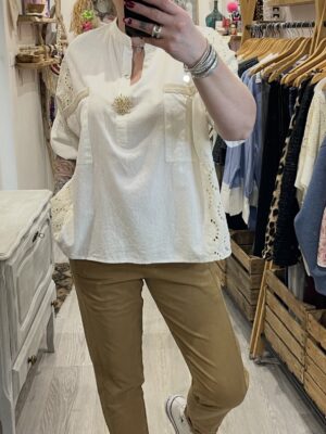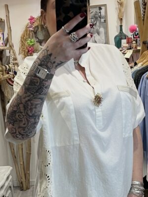 – Blouse oversize brodée avec sa jolie broche soleil dorée.