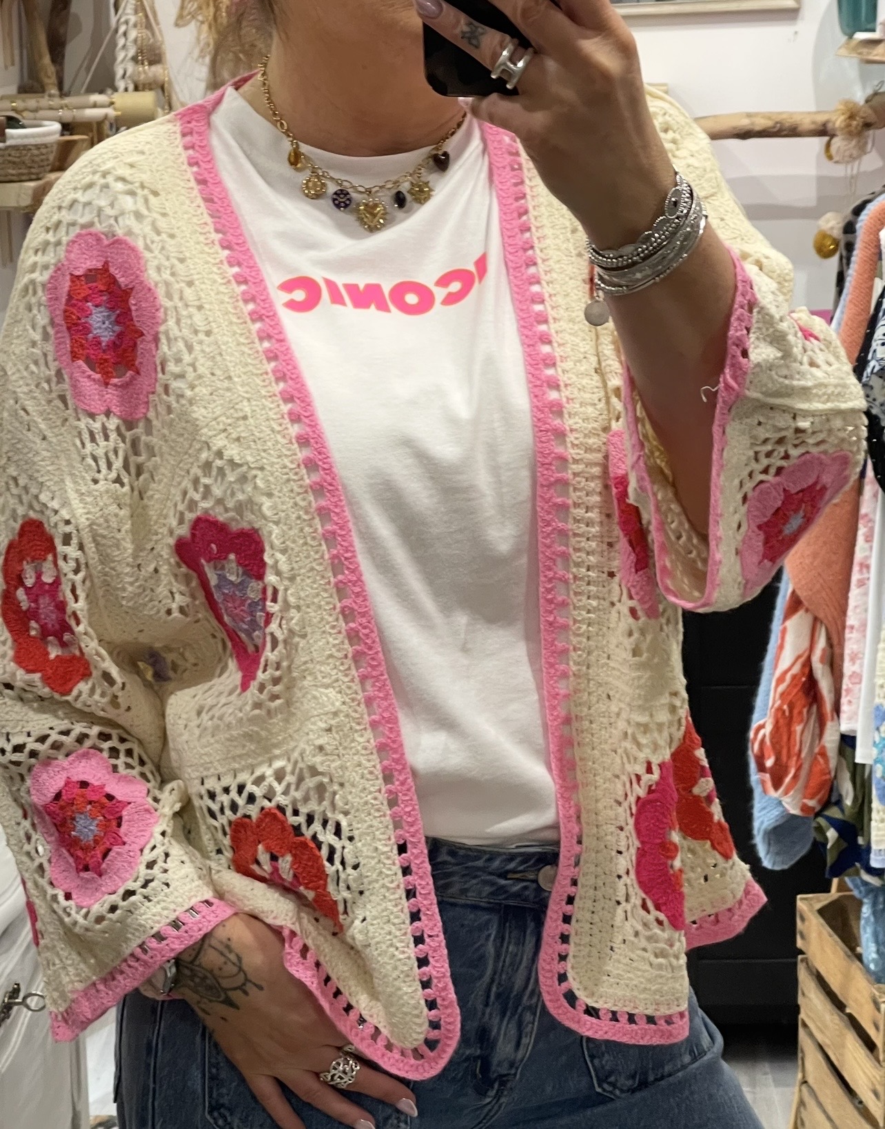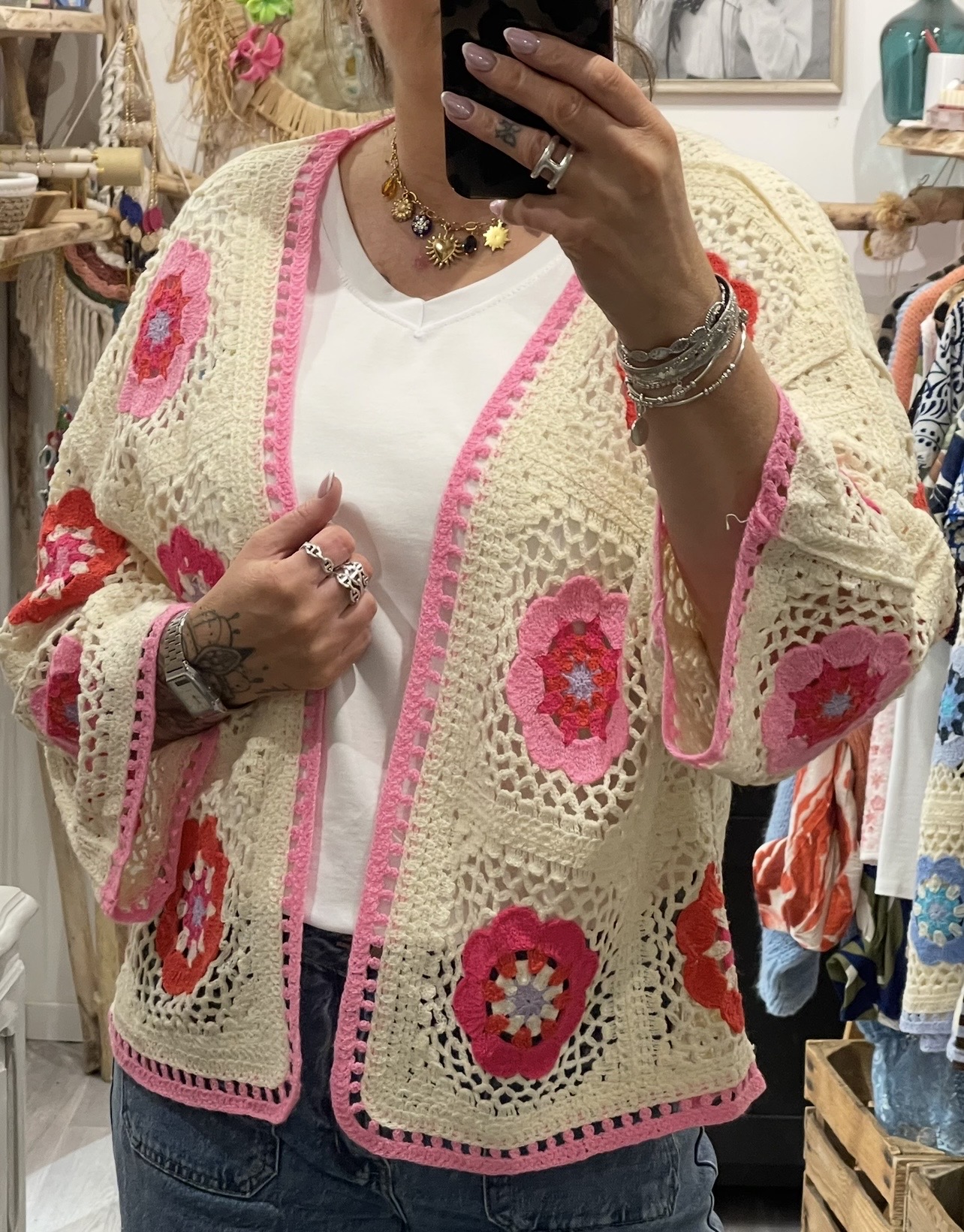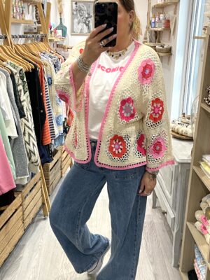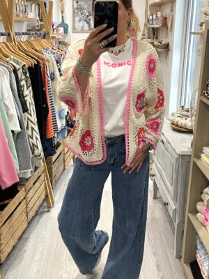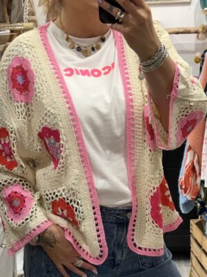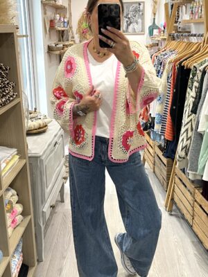 – Cardigan oversize en crochet, au style bohème.