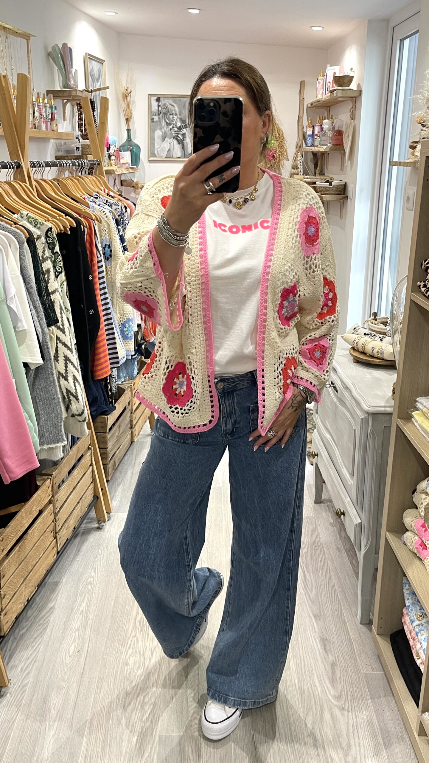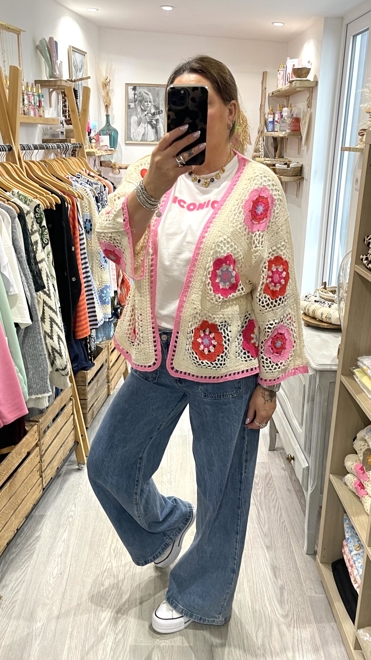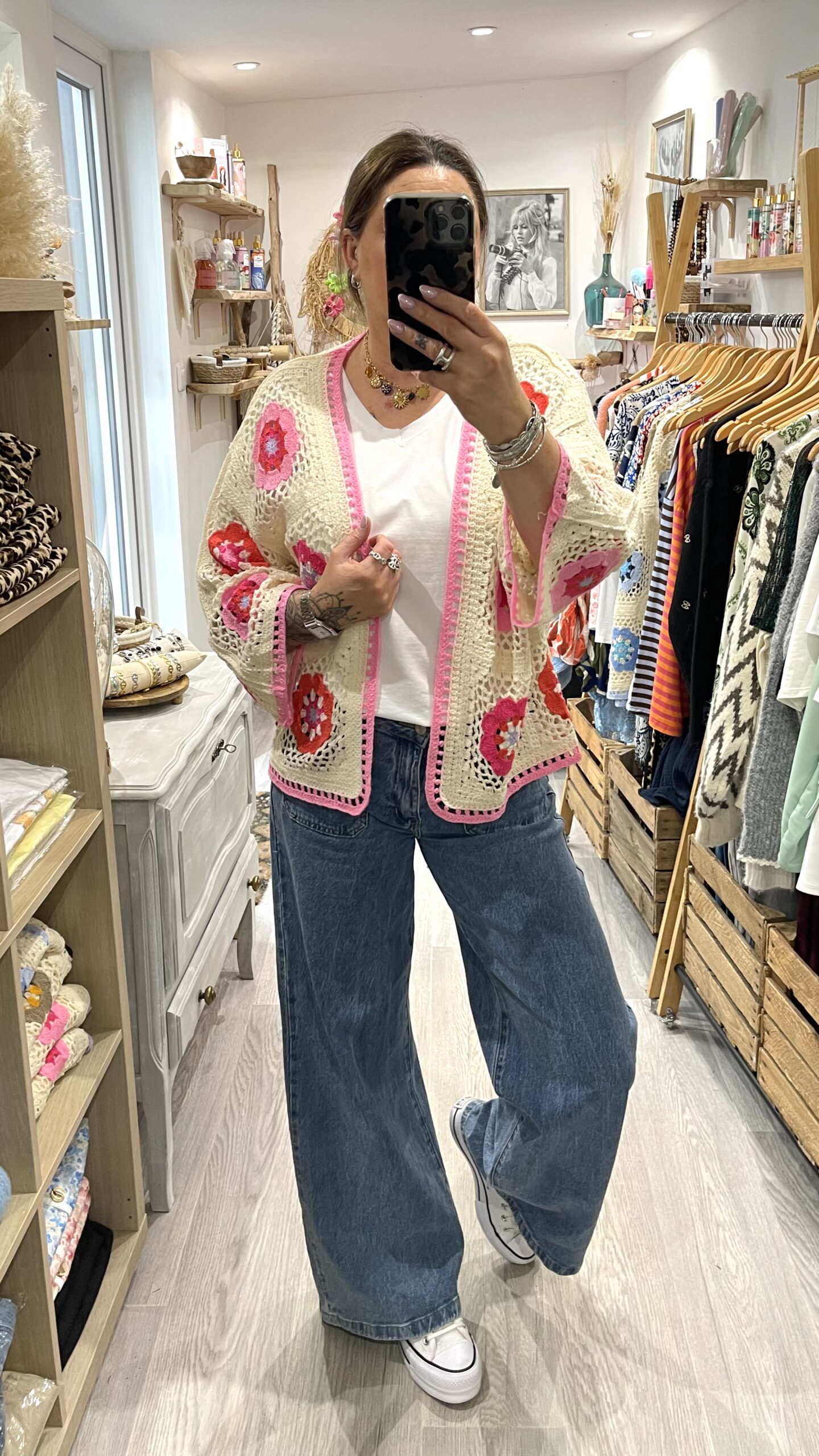 – Cardigan oversize en crochet, au style bohème.