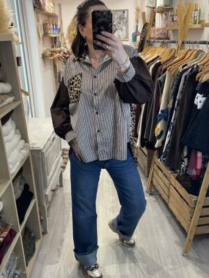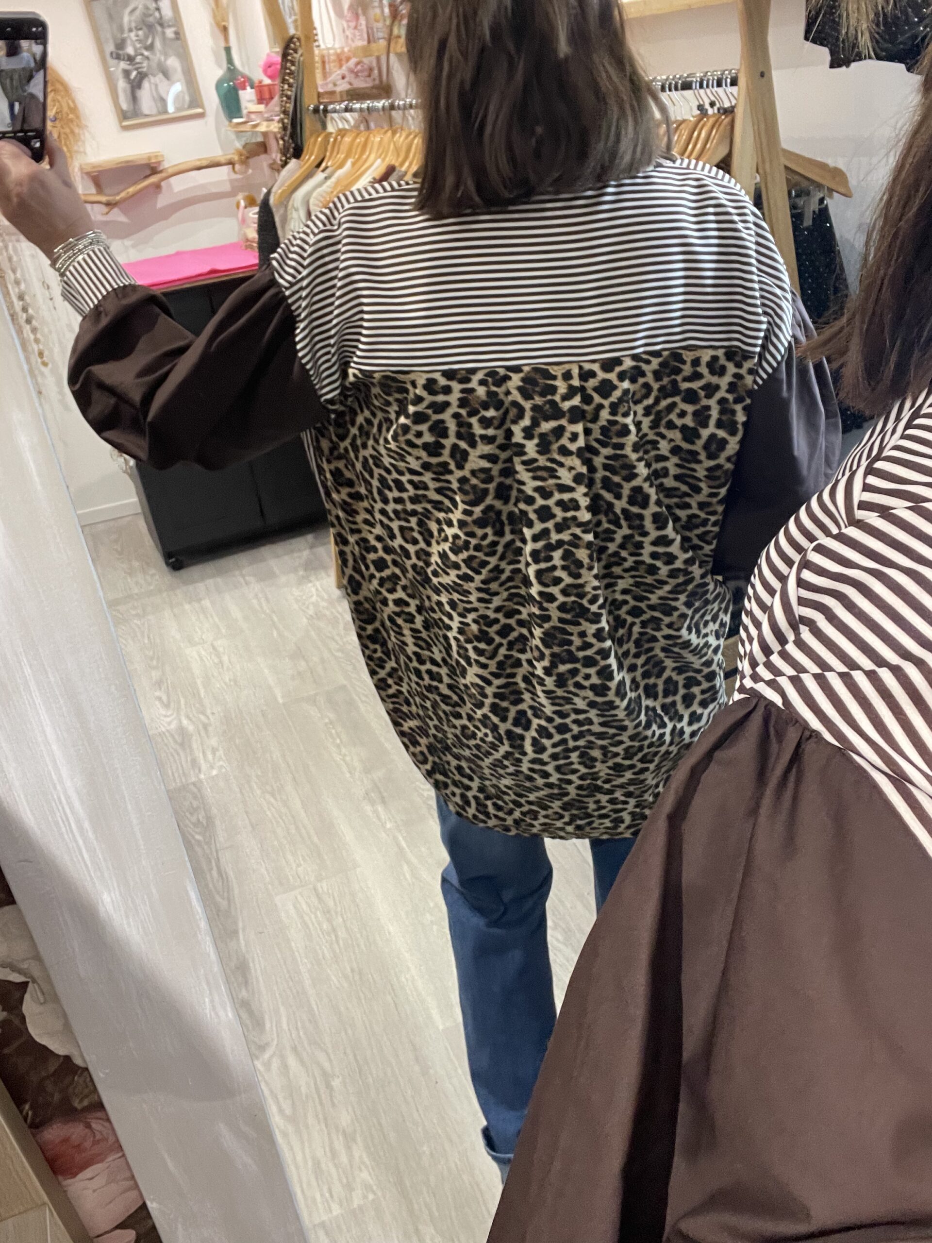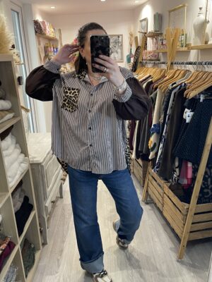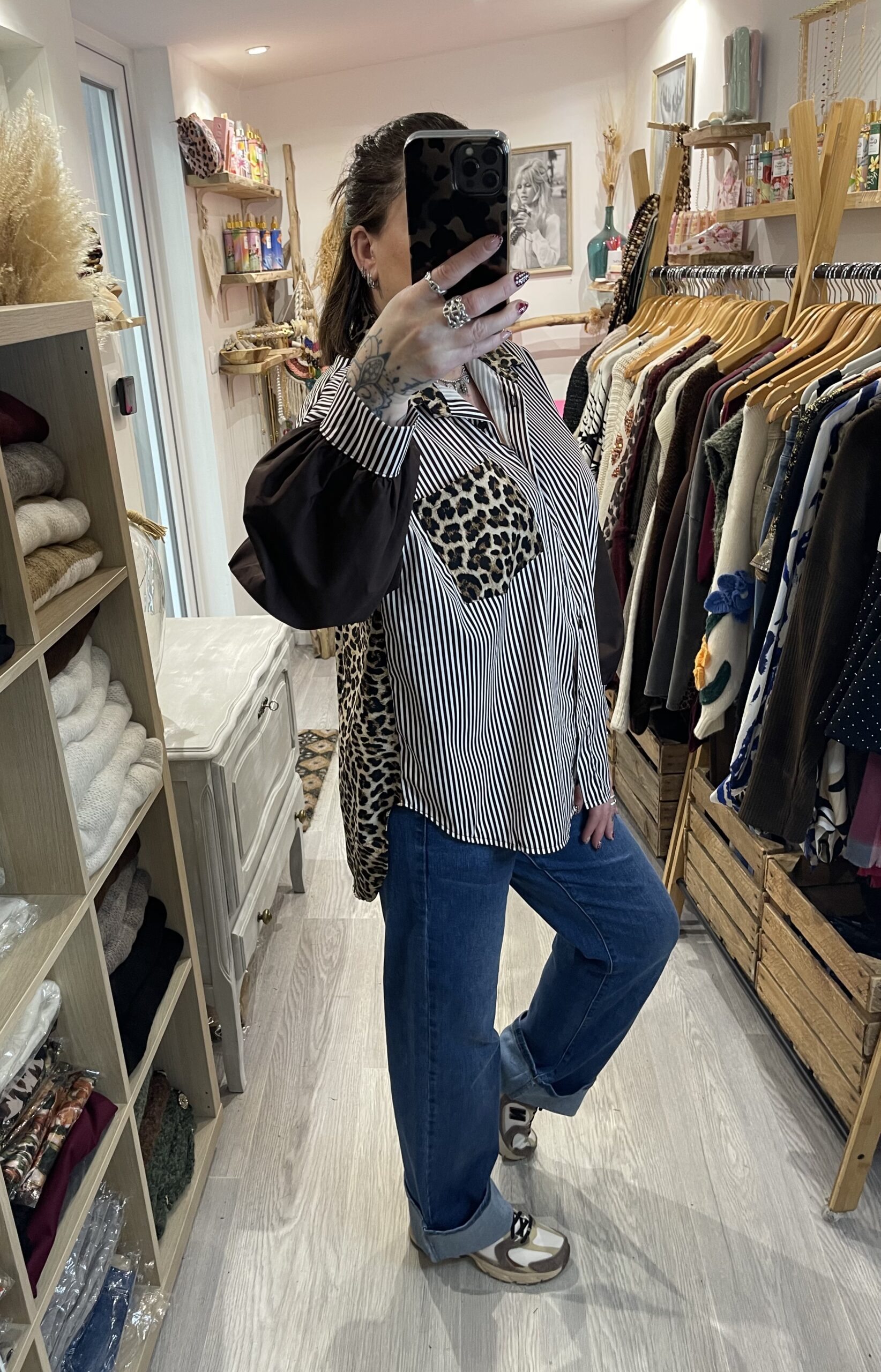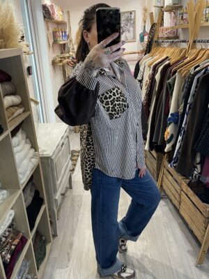 – Chemise oversize, à fines rayures, manches unies, rehaussée d’un élégant imprimé léopard 🐆 au niveau du col, de la poche avant et du dos.