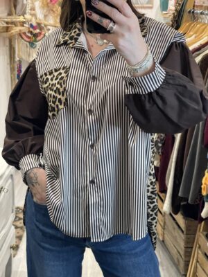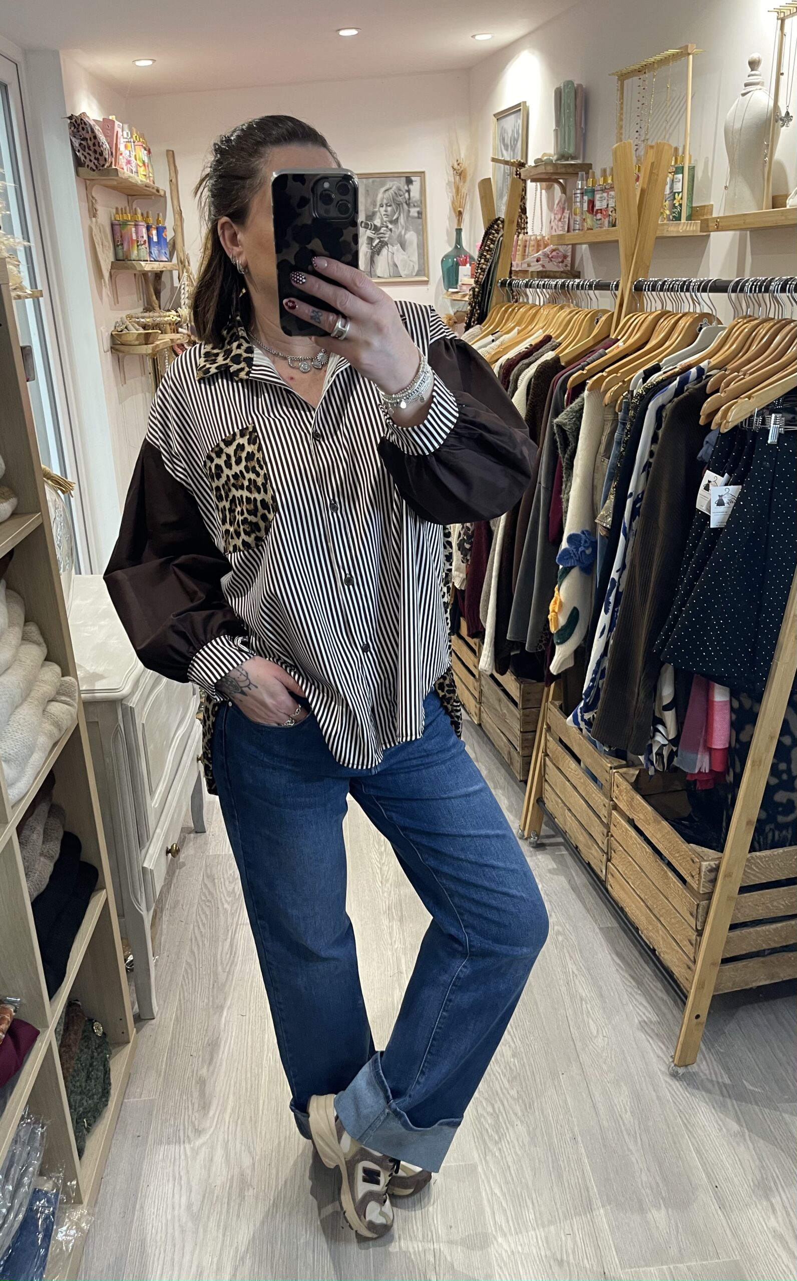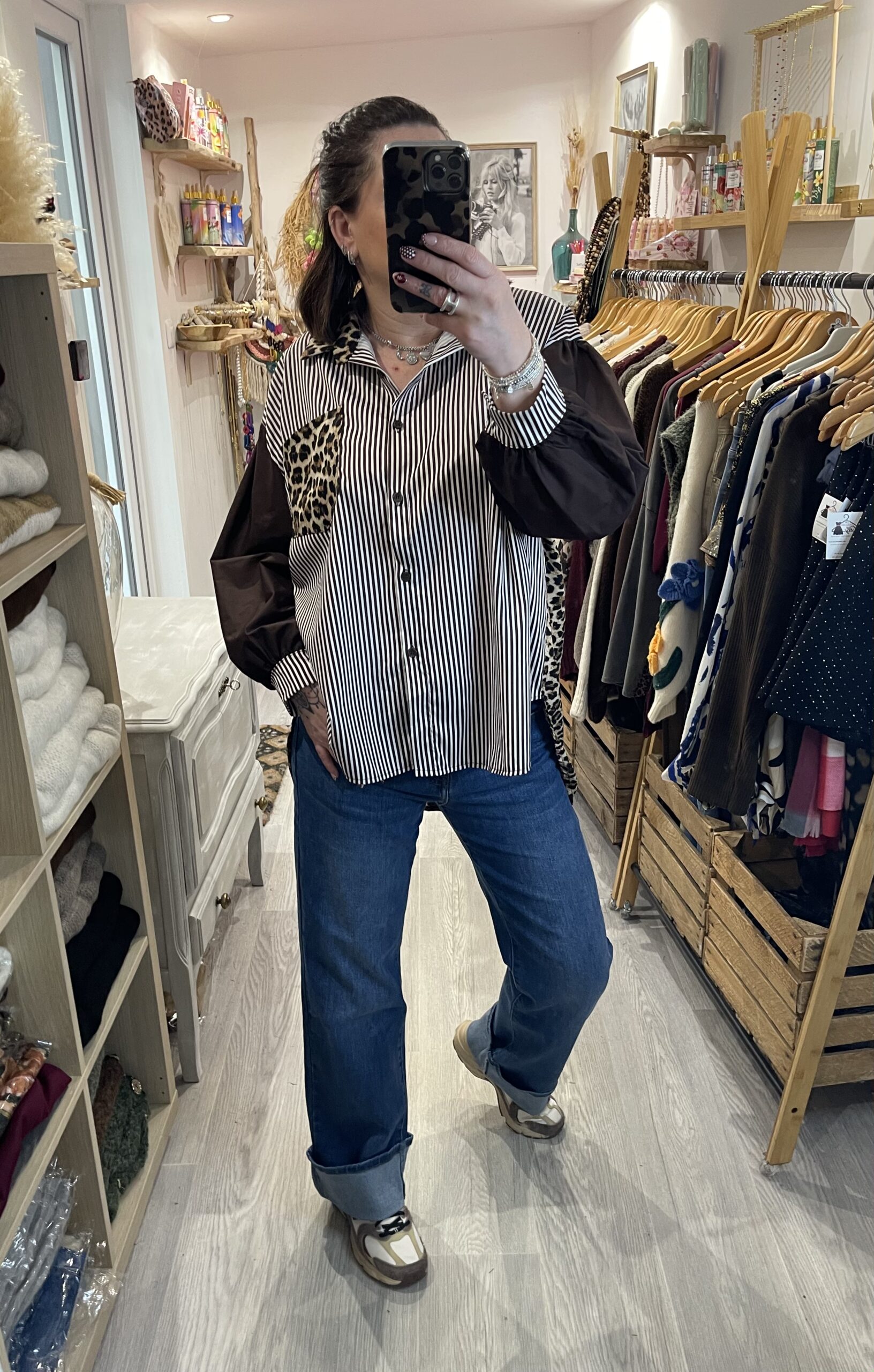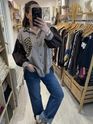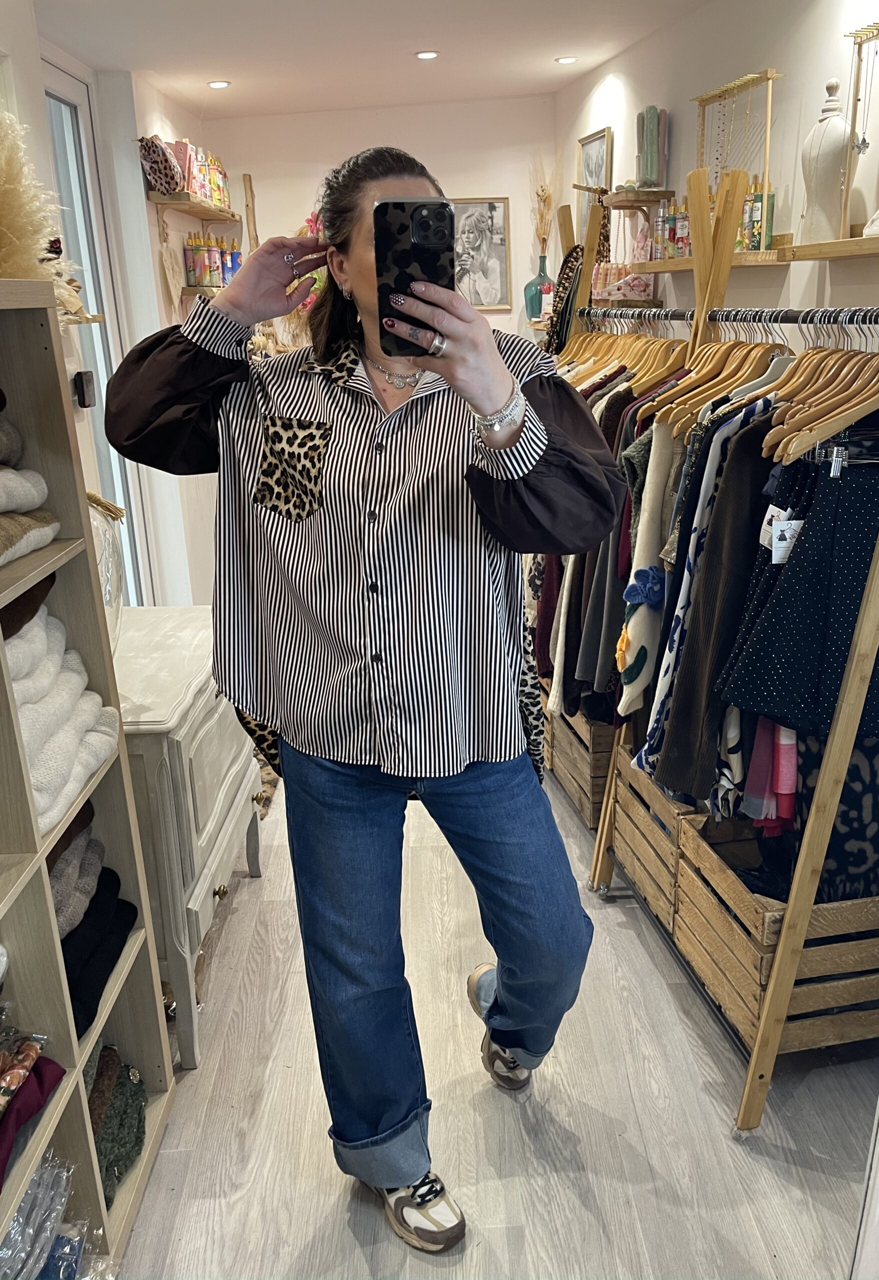– Chemise oversize, à fines rayures, manches unies, rehaussée d’un élégant imprimé léopard 🐆 au niveau du col, de la poche avant et du dos.