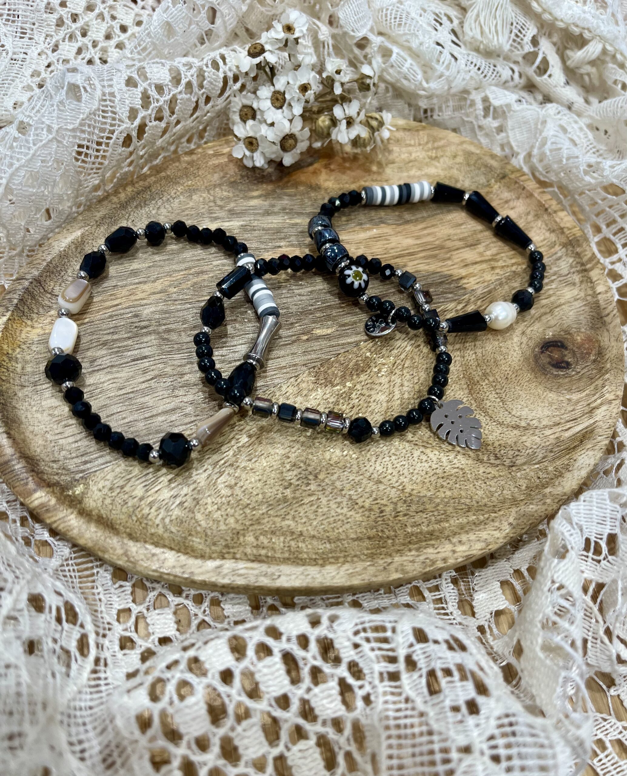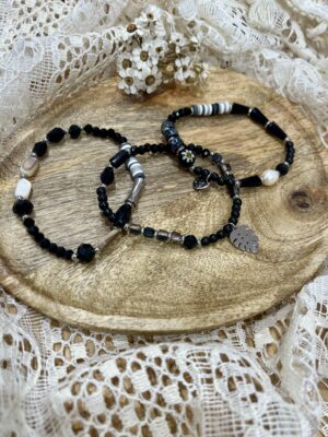 – Lot de 3 bracelets élastiques perles argentés en acier inoxydable et nacre.