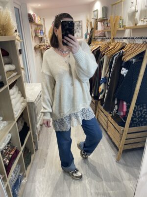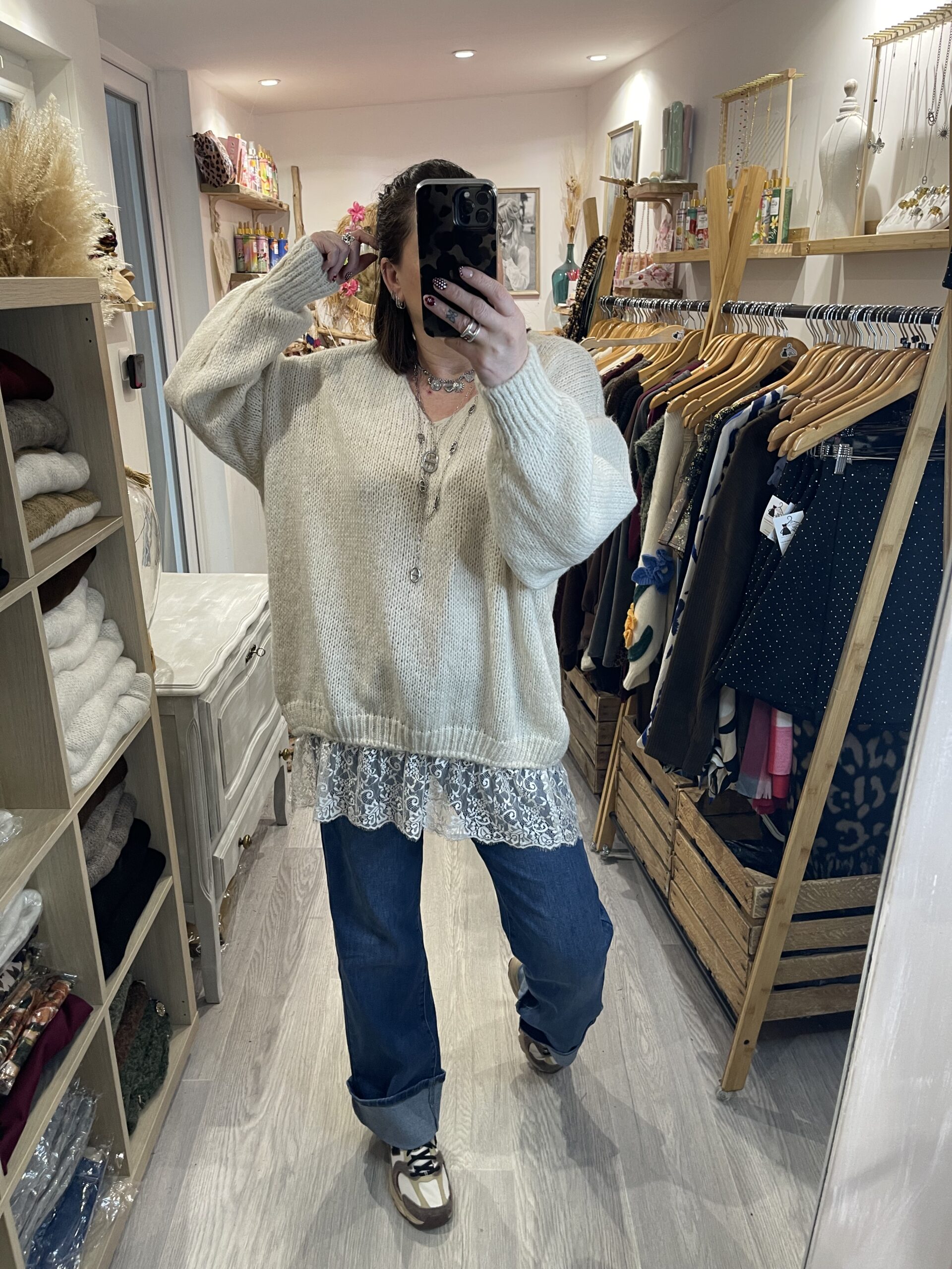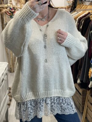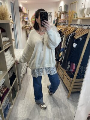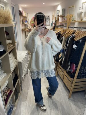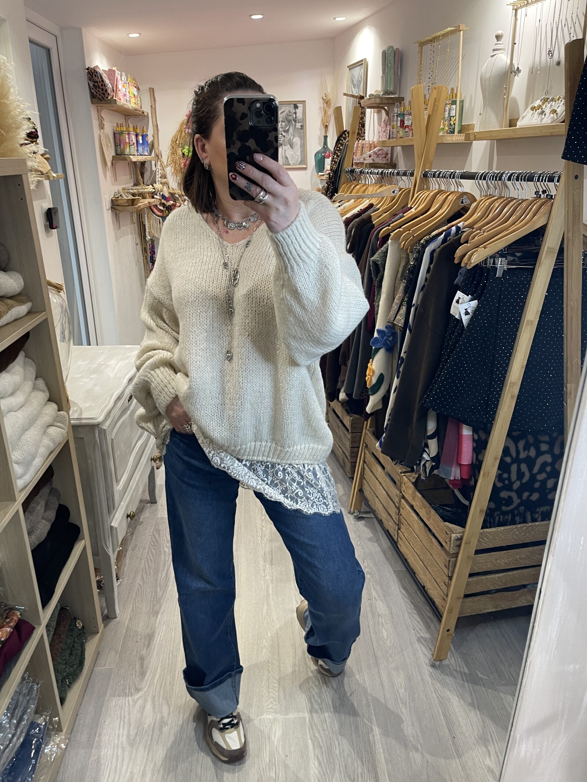 – Pull aversize col V hyper doux, agréable à porter et avec une jolie finition dentelle sur le bas.
