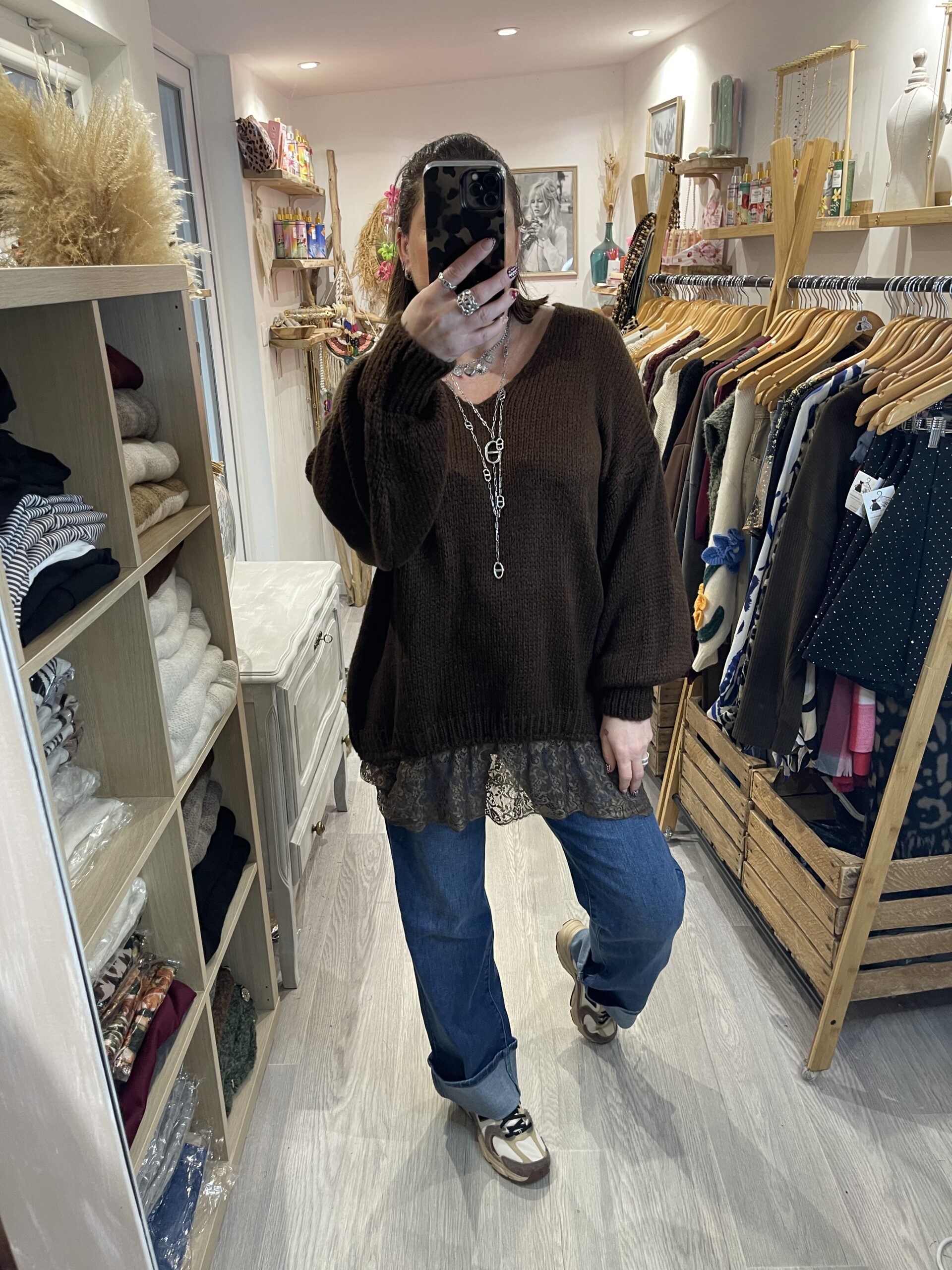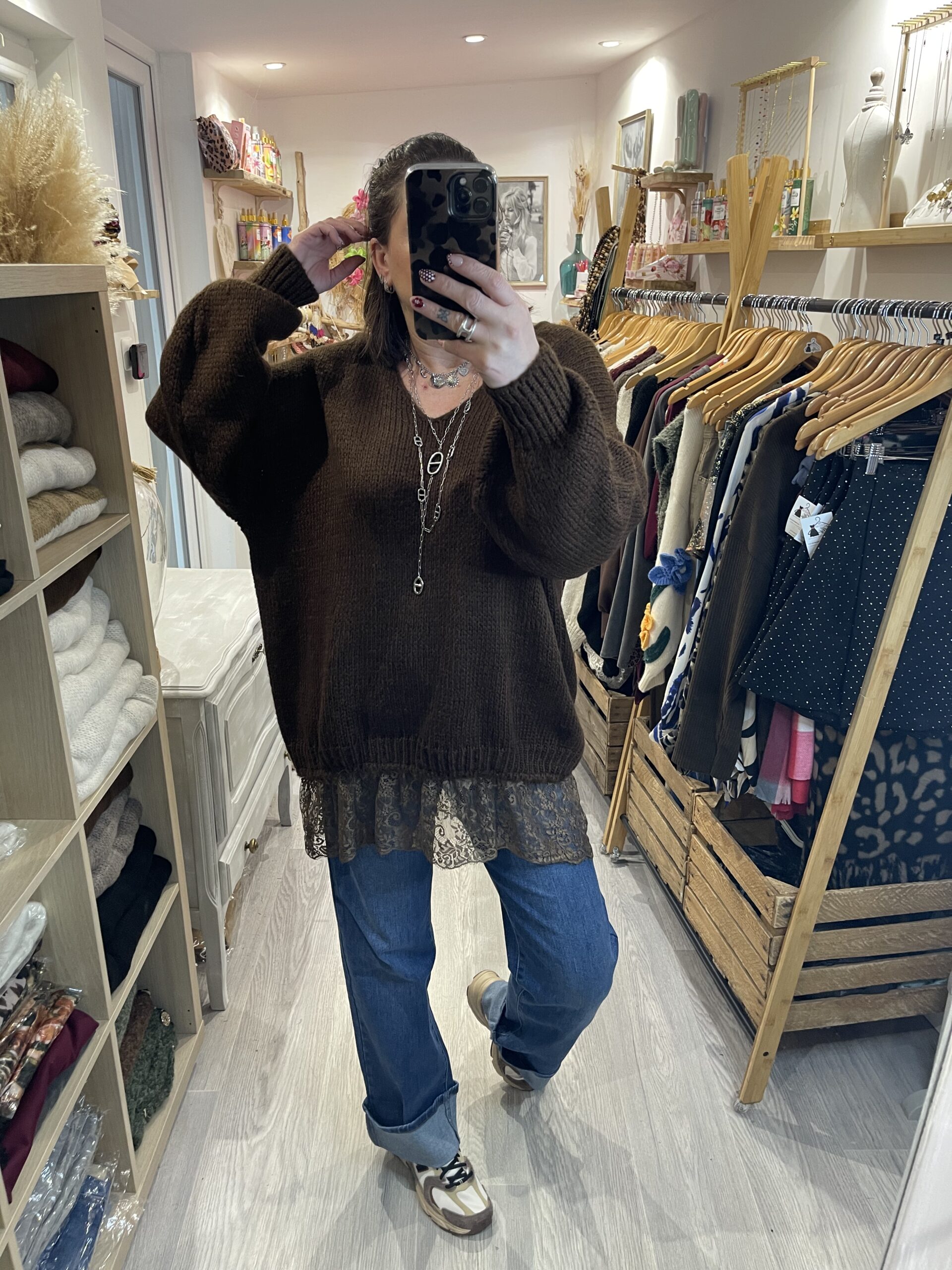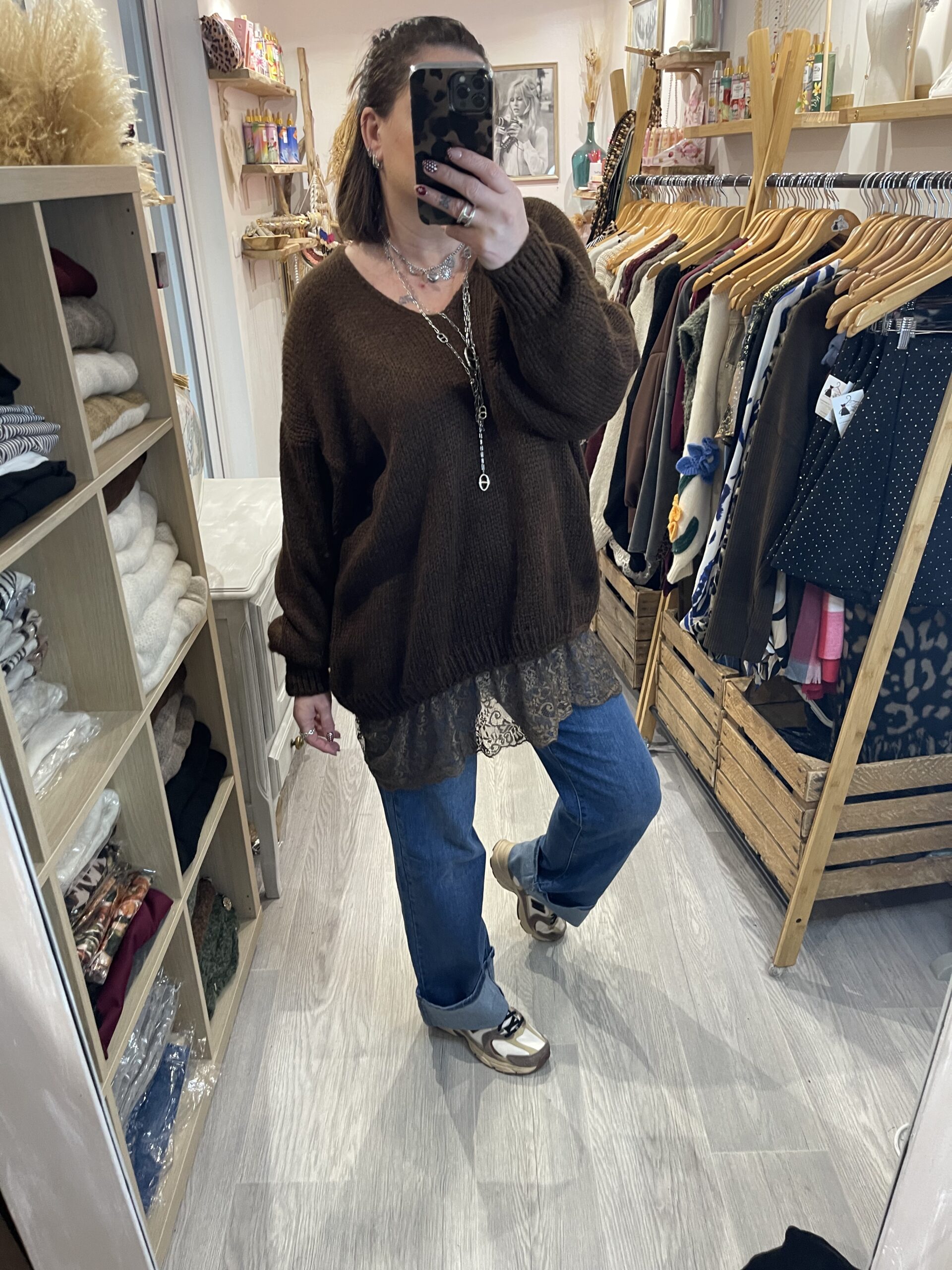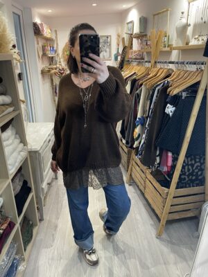 – Pull aversize col V hyper doux, agréable à porter et avec une jolie finition dentelle sur le bas.