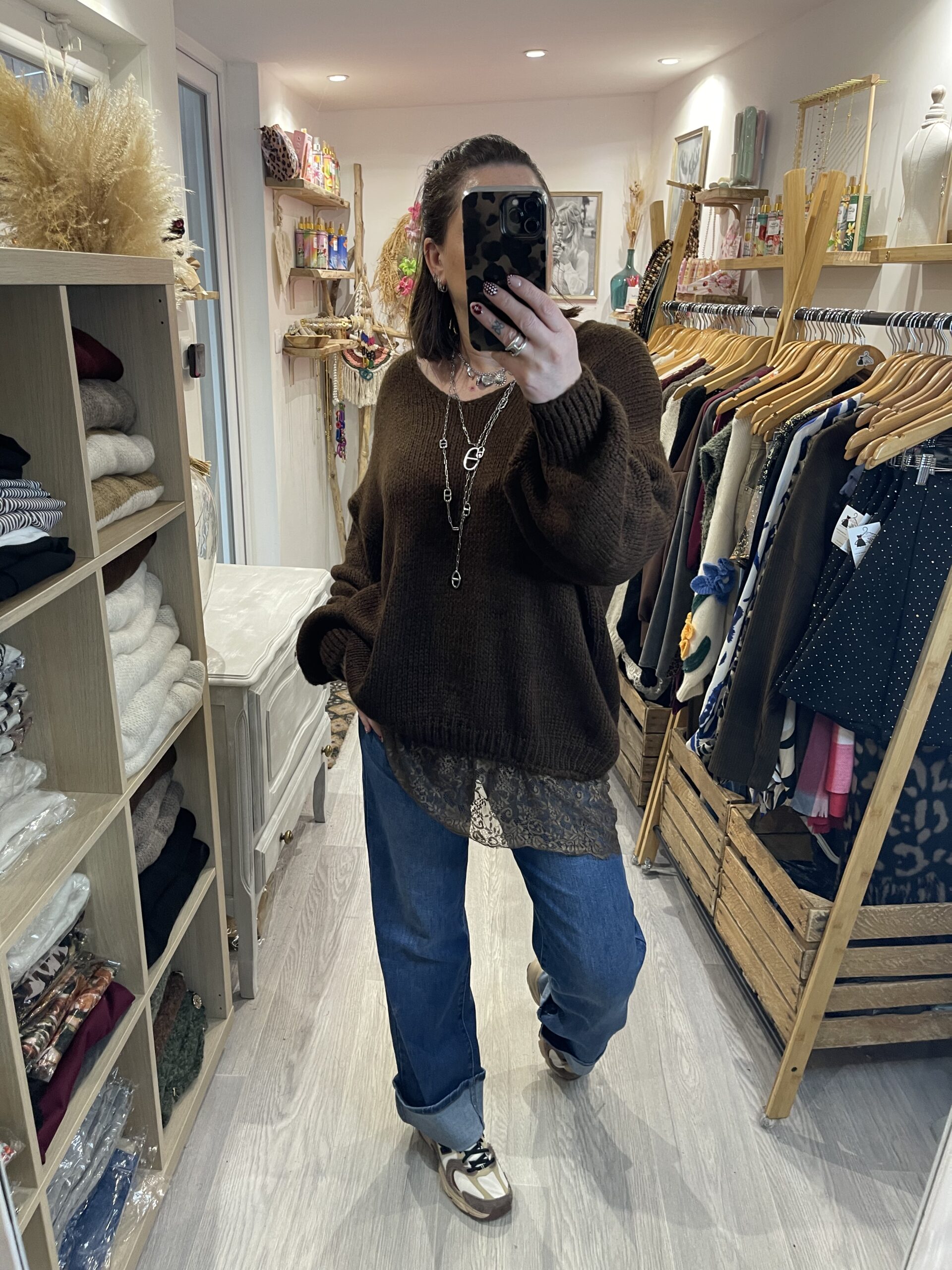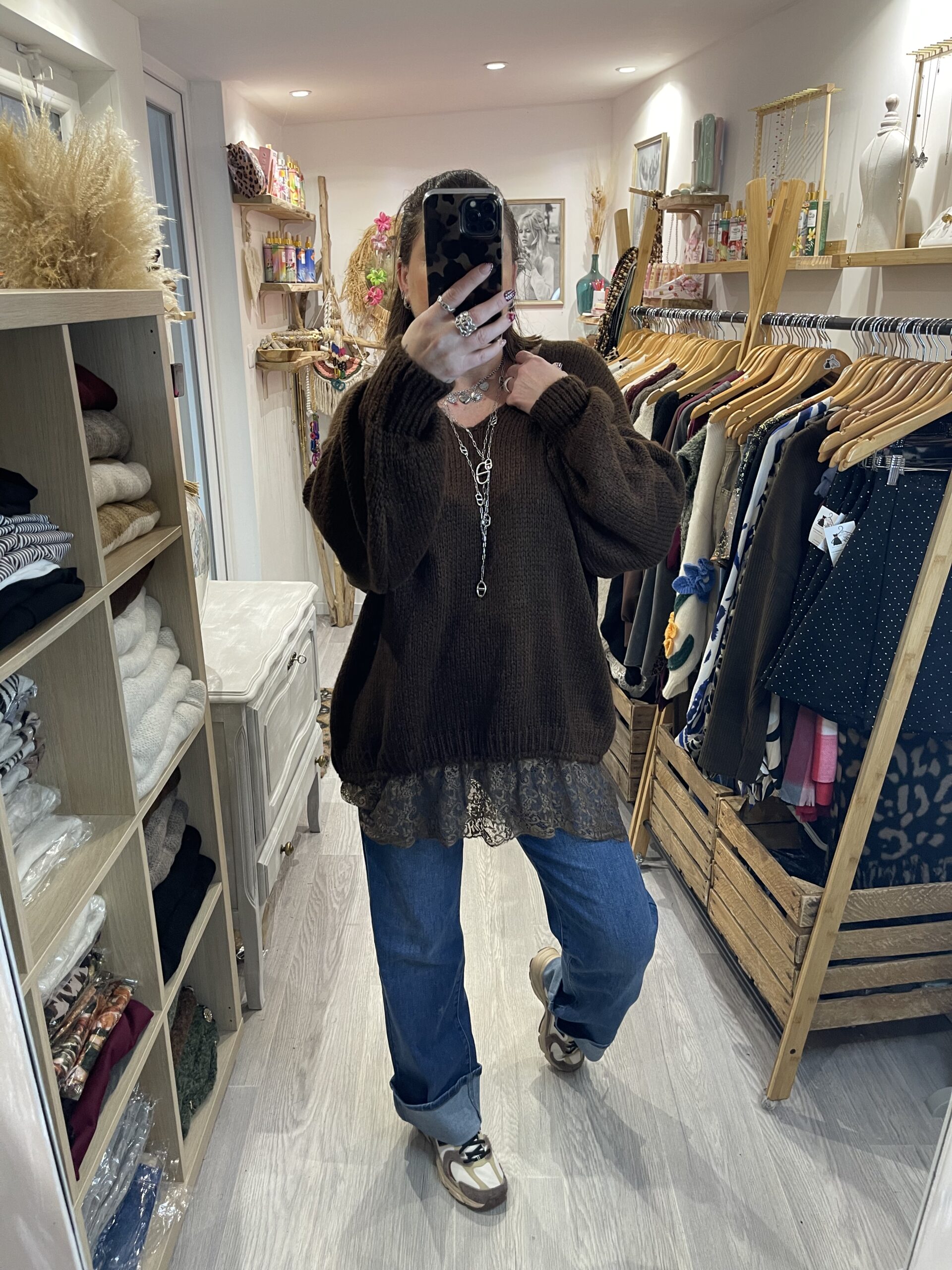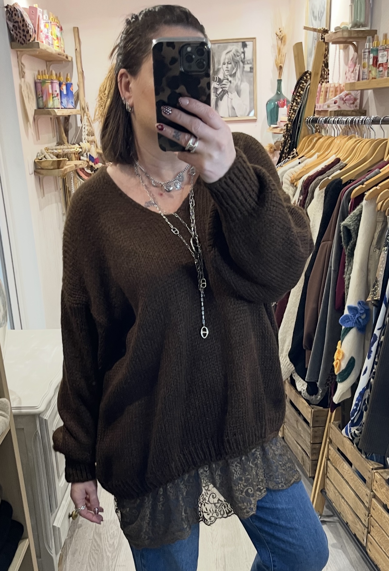 – Pull aversize col V hyper doux, agréable à porter et avec une jolie finition dentelle sur le bas.