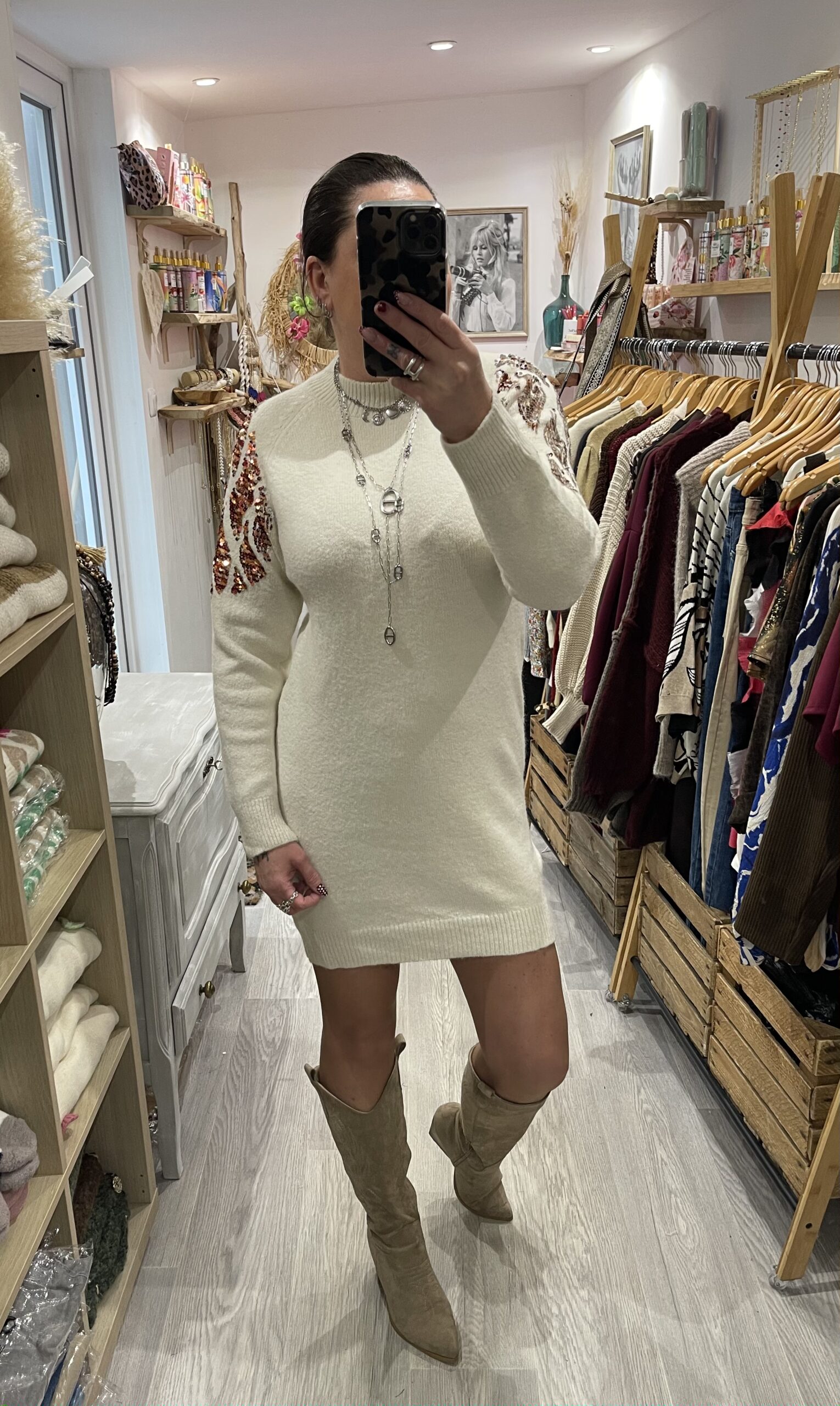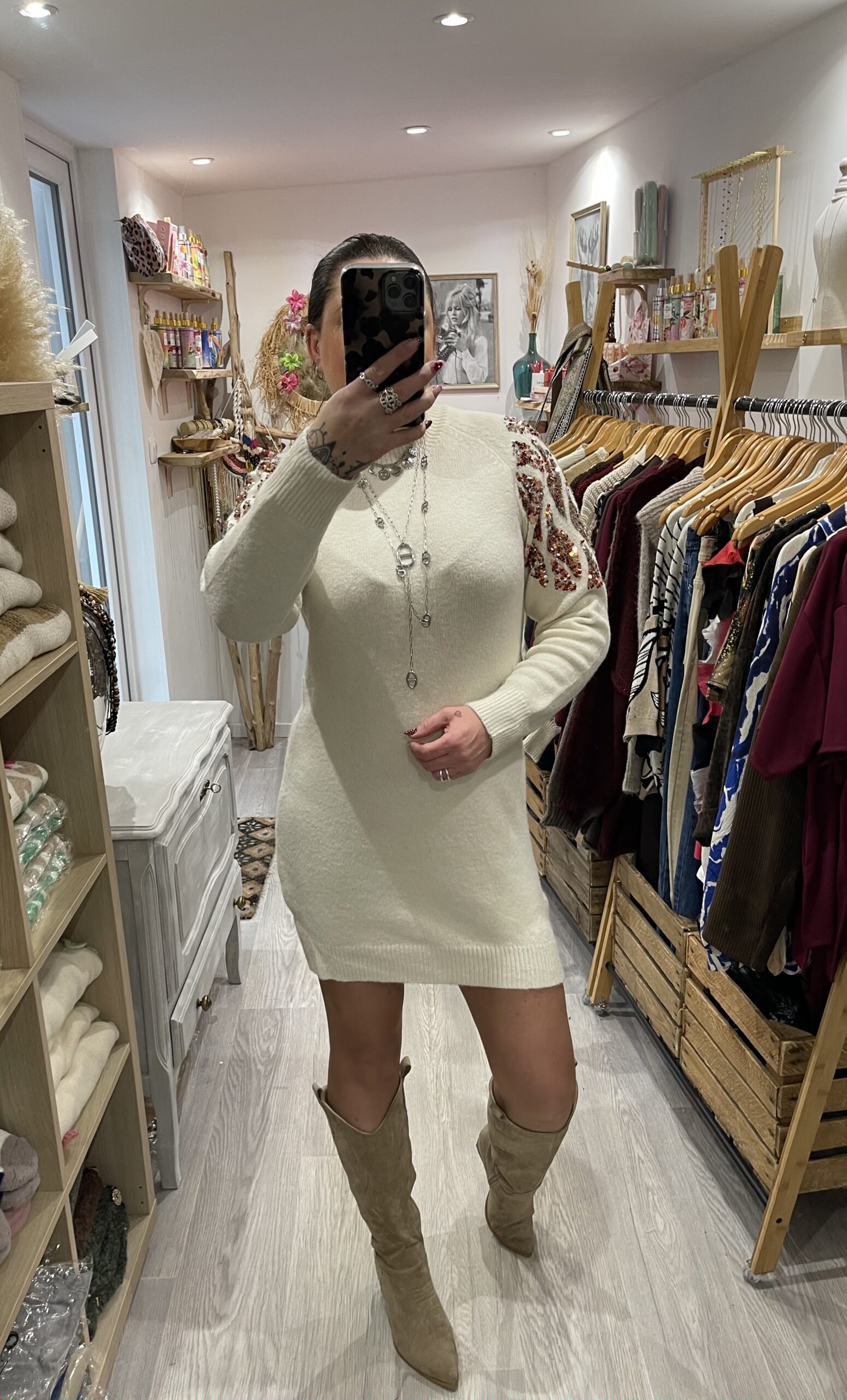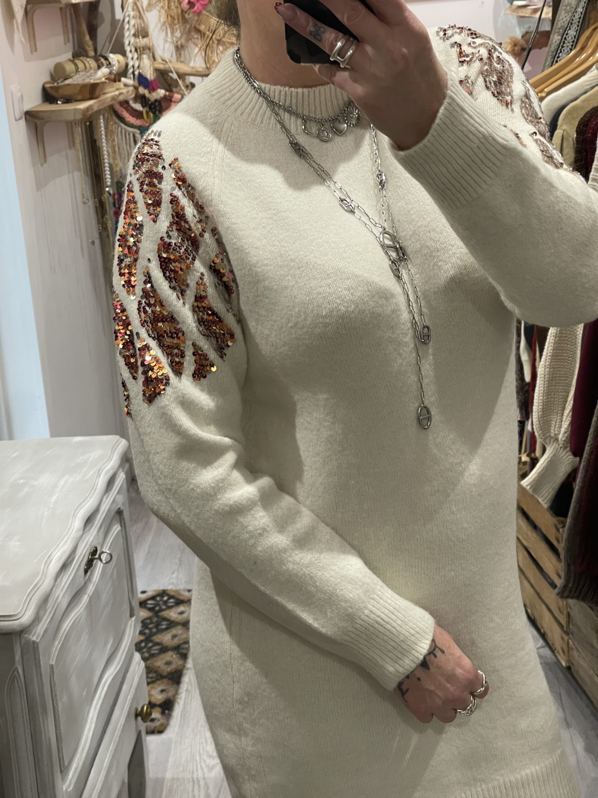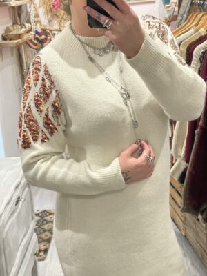 – Robe pull séduit par le haut de ses manches brodées de sequins.