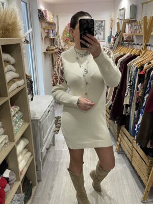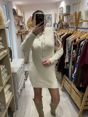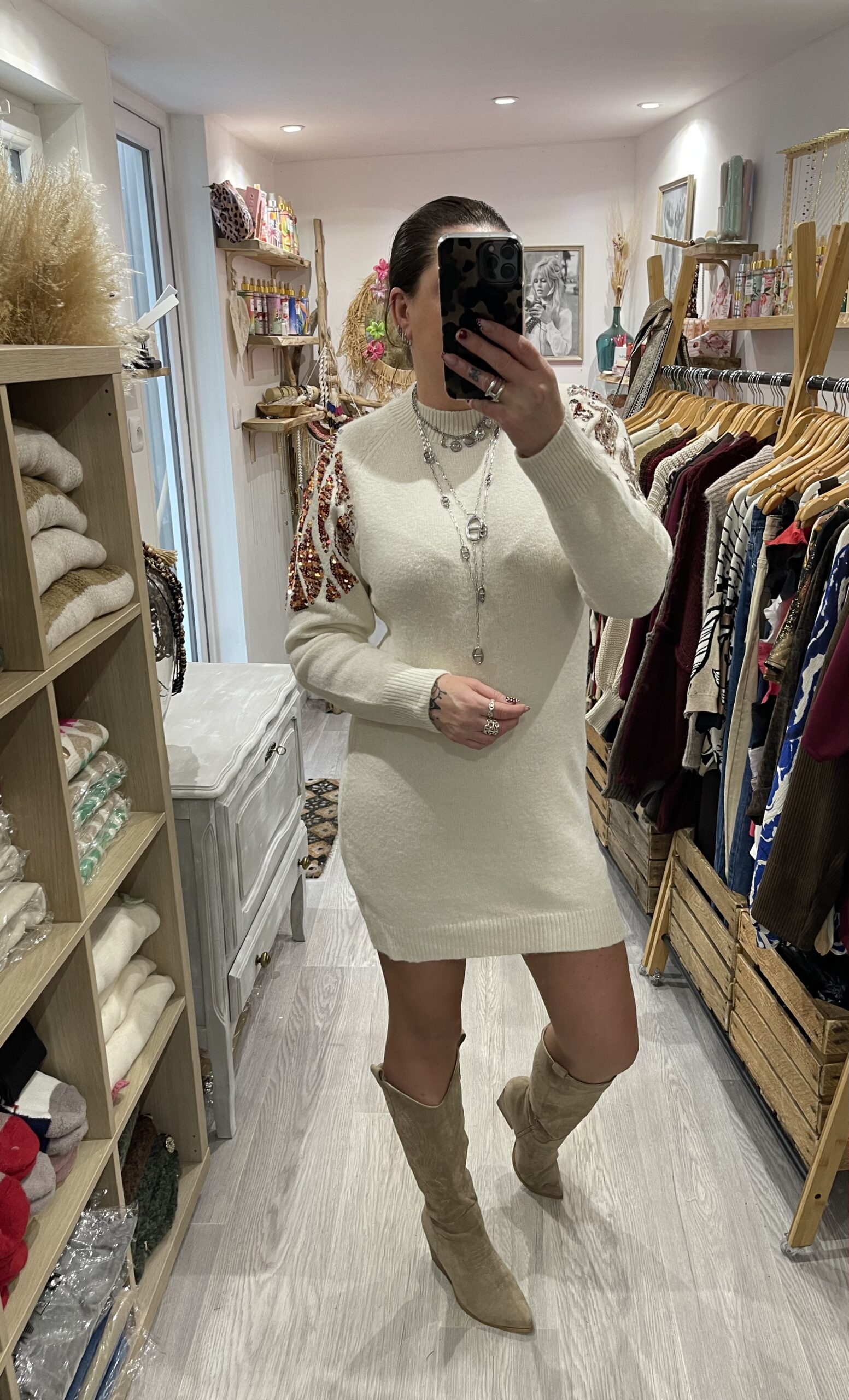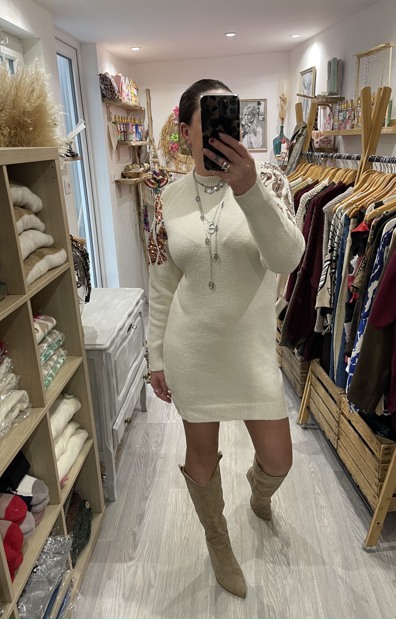 – Robe pull séduit par le haut de ses manches brodées de sequins.
