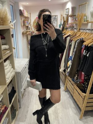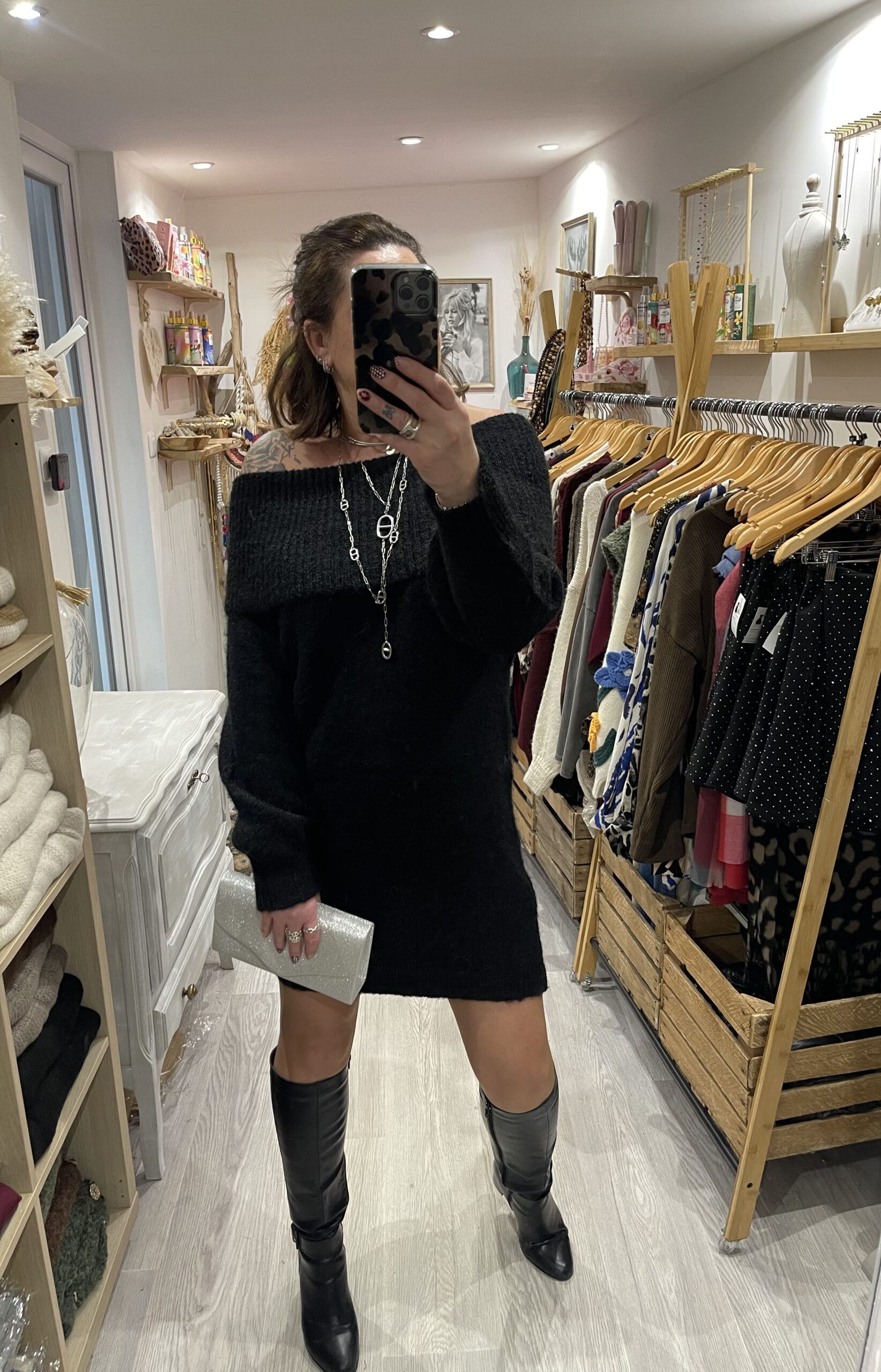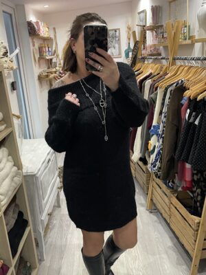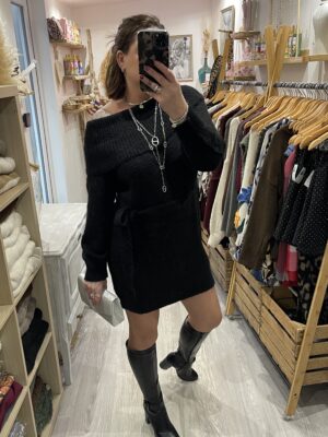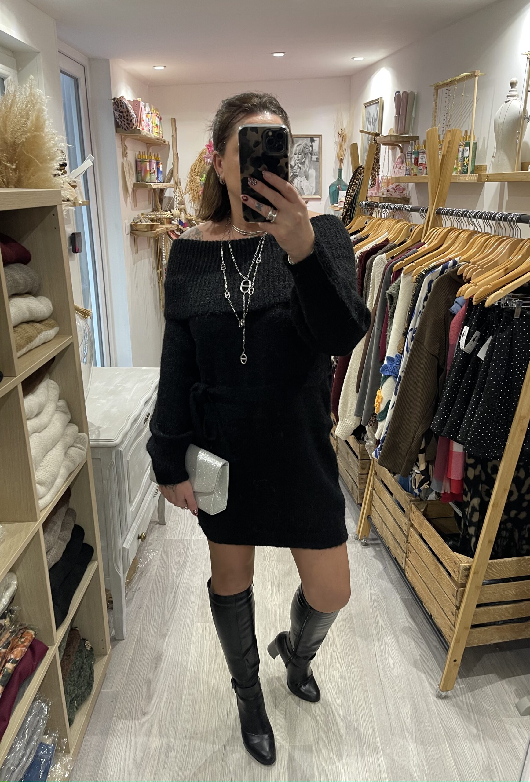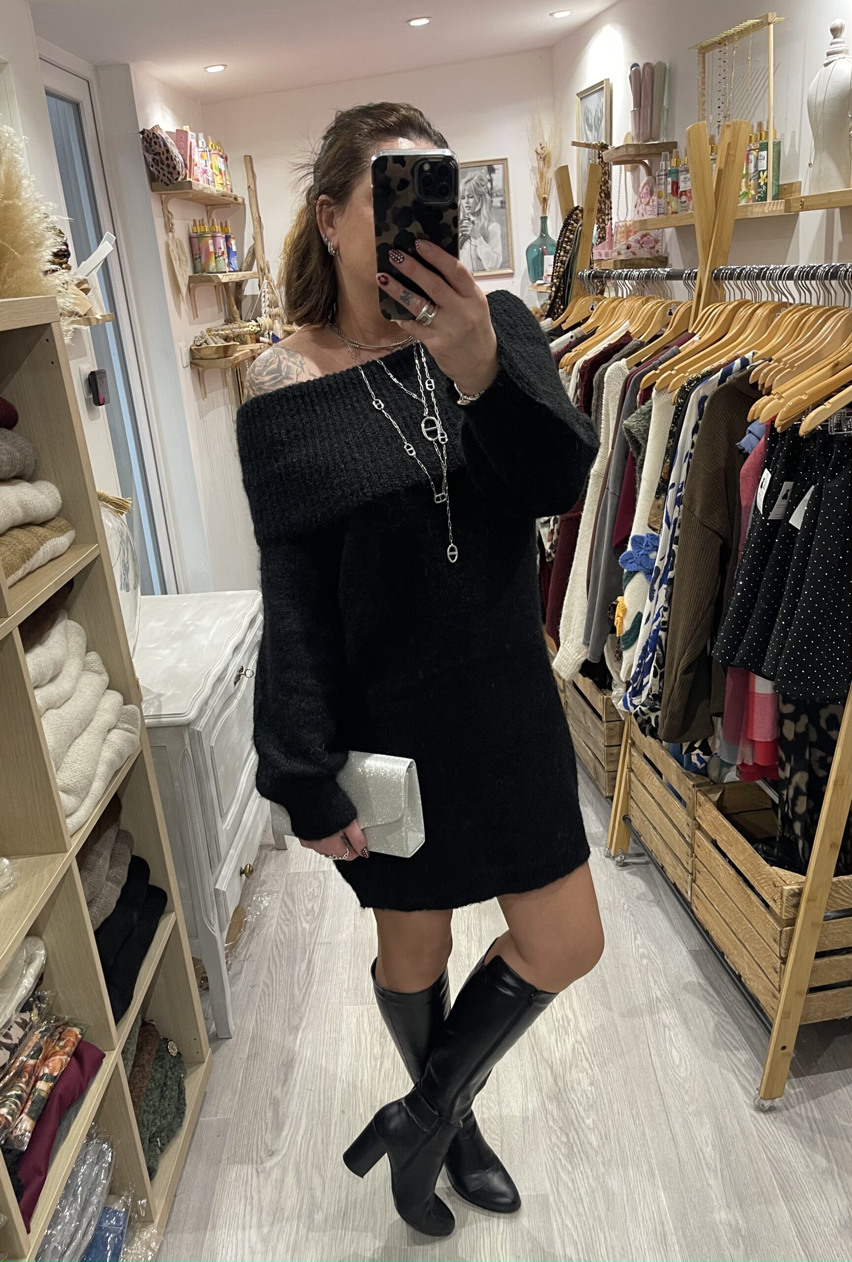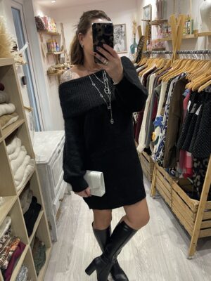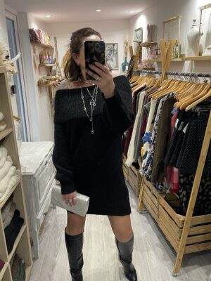 – Robe pull col bardot qui peut se porter de plusieurs façons.